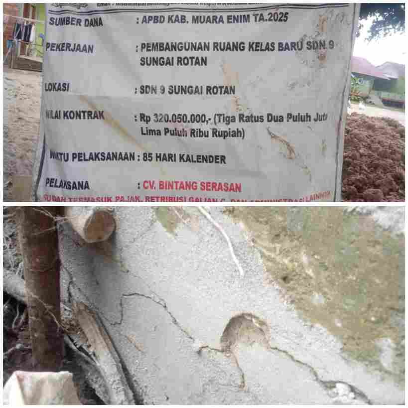 Muara Enim,mednas.id— Pembangunan gedung Sekolah Dasar 09 di Desa Sukamerindu, Kecamatan Sungai Rotan, Kabupaten Muara Enim memicu kemarahan warga. Pasalnya, sejumlah bagian pondasi bangunan tampak retak meski proses pembangunan belum rampung.