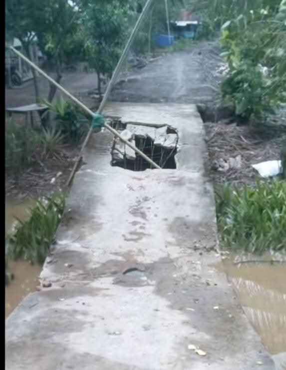 Banyuasin,mednas.id — Kondisi fasilitas publik kembali menjadi sorotan. Sebuah jembatan penghubung di Desa Terusan Dalam, Kecamatan Sumber Marga Telang, Kabupaten Banyuasin, mengalami kerusakan parah hingga ambruk dan nyaris tidak dapat difungsikan. Jembatan berbahan beton tersebut tampak retak, tergerus air, dan sebagian sudah roboh, menyisakan lubang besar serta besi konstruksi yang terlihat jelas.