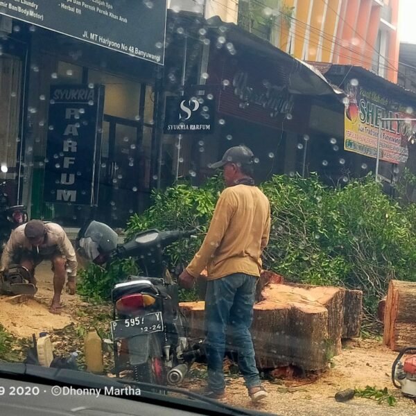 Berdasarkan pantauan di lokasi pada Selasa (27/1/2026) siang, sedikitnya lima orang pekerja terlihat menebang pohon berukuran besar di depan Toko Aneka Warna Perkasa dan Syukria Parfume.