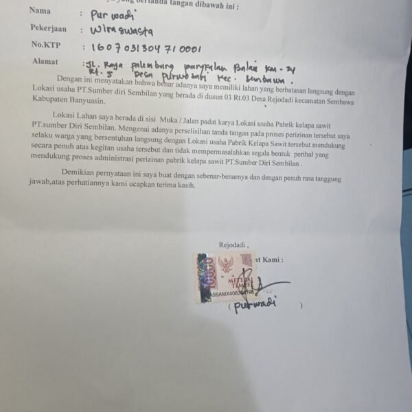 Dugaan manipulasi tanda tangan warga dalam proses perizinan lingkungan PT. Sumber Diri Sembilan (PT SDS) sempat memicu keresahan di tengah masyarakat Desa Rejodadi, Kabupaten Banyuasin. Persoalan yang menyangkut dokumen persetujuan warga—sebagai syarat administratif izin lingkungan—itu kini diklaim telah diselesaikan melalui klarifikasi langsung dan mediasi multipihak.