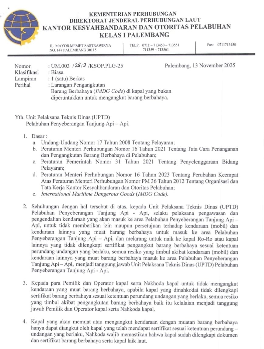 Klarifikasi ini disampaikan untuk meluruskan pemberitaan yang berkembang dan menegaskan komitmen KSOP Kelas I Palembang dalam menegakkan aturan keselamatan pelayaran serta mencegah pelabuhan disalahgunakan untuk kegiatan ilegal.