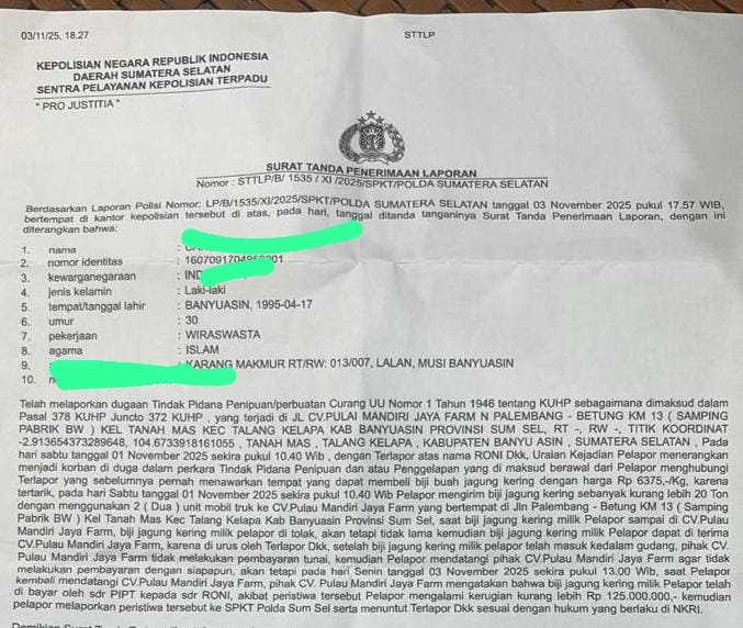– Chandra, warga Kecamatan Lalan, Kabupaten Banyuasin,meminta Polda Sumsel bertindak tegas atas LP/B/1535/XI/2025/SPKT/Polda Sumsel/ Tanggal. 03 November 2025. Chandra mengaku kecewa dan kesal terhadap pihak CV. Pulau Mandiri Jaya Farm (PMJF) yang hingga kini belum membayar hasil penjualan 20 ton jagung bijian kering miliknya senilai Rp120 juta.