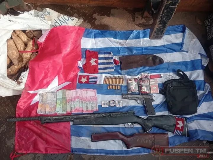 Dalam pengamanan lokasi, aparat berhasil mengamankan sejumlah barang bukti berupa satu pucuk pistol jenis P1, satu senapan angin, empat belas butir munisi kaliber 5,56 milimeter, delapan butir munisi kaliber 9 milimeter, bendera bintang kejora, uang tunai, serta perlengkapan lainnya yang diduga milik kelompok tersebut. Barang bukti ini selanjutnya diamankan untuk kepentingan penyelidikan lebih lanjut.