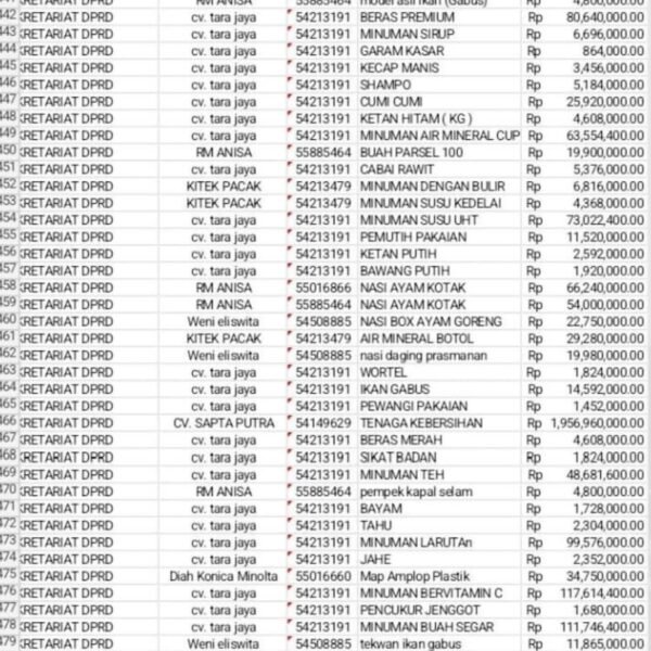 Data tersebut terungkap dari dokumen rincian belanja yang diperoleh awak media. Selain perlengkapan kebersihan, tercatat pula pembelian bahan makanan dan minuman dalam jumlah besar, antara lain beras, gula, minyak goreng, dan air mineral.