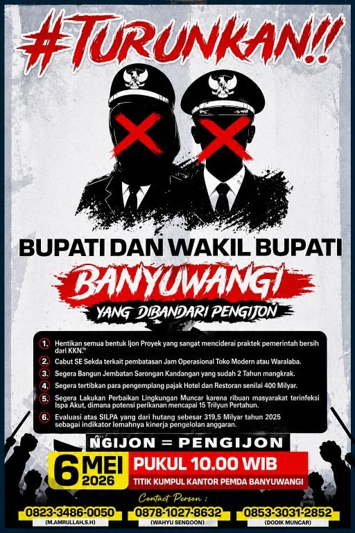 Aksi ini dijadwalkan berlangsung pada Rabu, 6 Mei 2026, pukul 10.00 WIB, dengan titik kumpul di Kantor Pemda Banyuwangi.